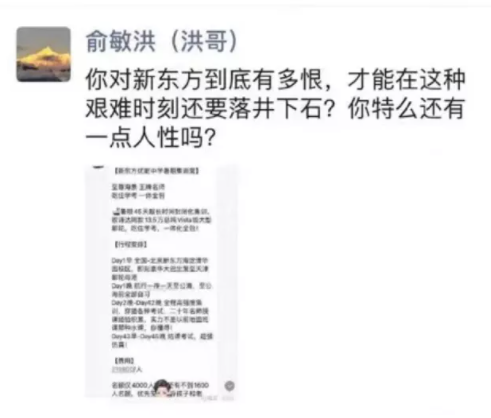 外界关注俞敏洪会如何拯救公司。日前一则传言称“新东方优能中学暑期集训营”计划在公海邮轮上举办,对此,俞敏洪在朋友圈愤怒辟谣:“你对新东方到底有多恨,才能在这种艰难时刻还要落井下石?”