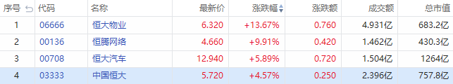 华盛资讯8月10日消息,恒大系午后持续走强, 恒腾网络涨幅扩大至10%;恒大物业涨超13%,股价现报6.32港元,成交额4.93亿港元,最新市值6.83亿港元;恒大汽车、中国恒大涨超4%。