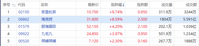 华盛资讯8月10日消息,餐饮股午后持续发力,截至发稿,奈雪的茶上涨9.74%;海底捞上涨8.59%;颐海国际上涨4.20%;九毛九上涨3.97%;呷哺呷哺上涨2.30%。