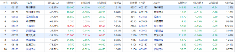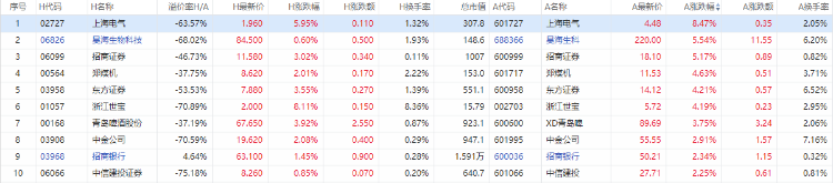 上海电气A股收涨8.47%,H股截至发稿涨5.95%;昊海生物科技A股涨5.54%,H股截至发稿涨0.06%;招商证券A股涨5.17%,H股截至发稿涨3.02%;郑煤机A股涨4.63%,H股截至发稿涨2.01%。