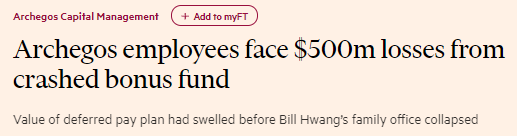 除了多家大型金融机构损失惨重,而Archegos的前员工们恐怕也没法置身事外——因为他们本应拿到的一大笔递延奖金可能因爆仓“随风而逝”了。
