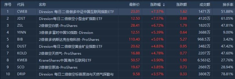 从ETF涨幅榜来看,涨幅居前的ETF集中在做空黄金、做多生物技术以及做多中国互联网等方面。其中,每日二倍做多中证中国互联网指数ETF $CWEB 和每日二倍做空小型金矿指数ETF $JDST 均涨超7%;2倍做空白银 $ZSL 涨6.72%,成交额1820万美元;