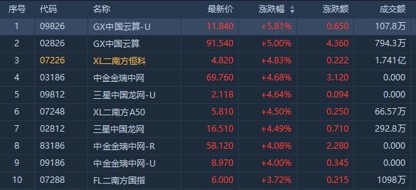 今日港股涨幅居前是GX中国运算ETF $02826.HK ,涨超5%,成交额794.3万港元;此外,南方两倍做多恒科 $07226.HK 涨4.83%,成交额1.74亿港元;南方两倍做多A50 $07248.HK 涨4.50%。