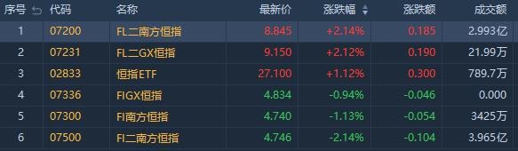 受消息影响,今日港股涨幅居前的ETF有GX两倍看多恒指 $07231.HK ,收涨2.12%;南方两倍看多恒指 $07200.HK 收涨2.14%,成交额达2.99亿港元。