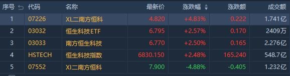 南方两倍做多恒科 $07226.HK 收涨4.83%,成交额1.74亿港元;