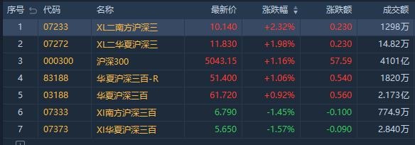 沪深300指数收涨1.16%。其中,华夏沪深三百ETF $03188.HK 涨0.93%,成交额2.17亿港元;华夏沪深三百-R $83188.HK 收涨1.06%,成交额达1820万港元。
