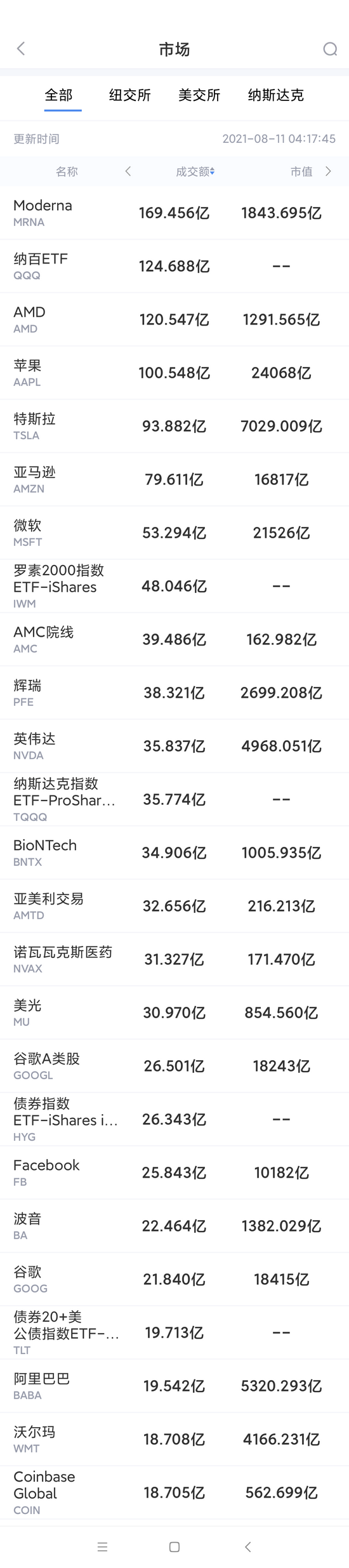 第10名BioNTech收跌6.9%,成交34.9亿美元。随着新冠疫苗的需求飙升,BioNTech销售额连续第二个季度超出预期,净利润升至近28亿欧元,同比去年扭亏为盈。该公司周一表示,预计其与辉瑞共同开发的新冠疫苗全年收入将达到约159亿欧元,远高于此前预测的124亿欧元。