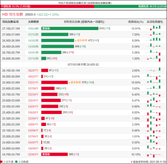 街货分布方面,至周二,恒指牛证街货重货区在收回25500点至26000点之间,累计相当约1318张期指合约;恒指熊证街货重货区仍在收回价26600点至27200点之间,累计相当约2500张期指合约。