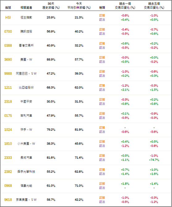 周二恒指相关权证的平均引伸波幅约21.3%,按日略有下降。个股方面,阿里及比迪相关认购证的引申波幅按日显降调升;相反,港交所、长汽、信义等相关购证的引申波幅则按日调升显著。