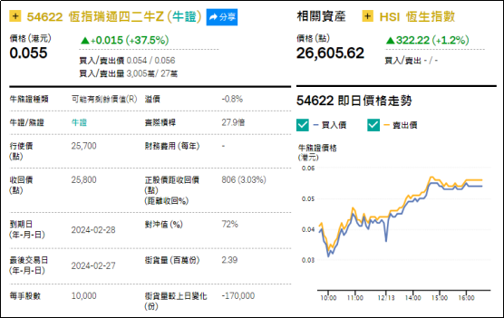 1、强势轮证:恒指瑞通四二牛(54622.HK),周二上涨37.5%;
