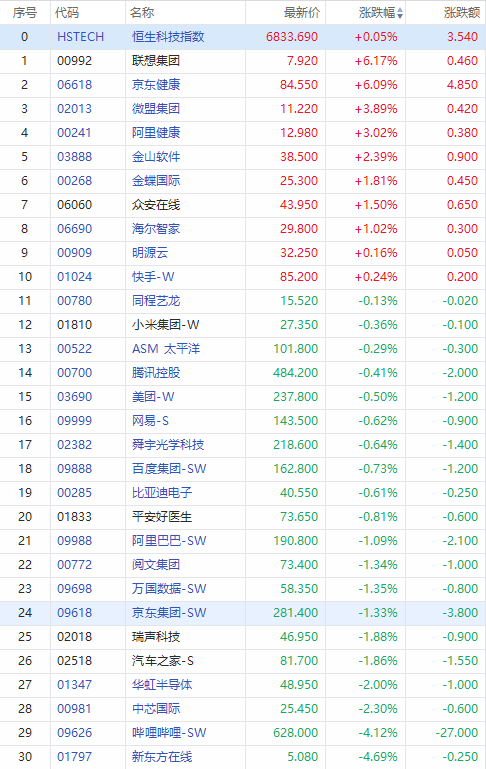成分股中,京东健康、联想集团涨超6%,微盟集团、阿里健康涨超3%%,金山软件涨超2%。