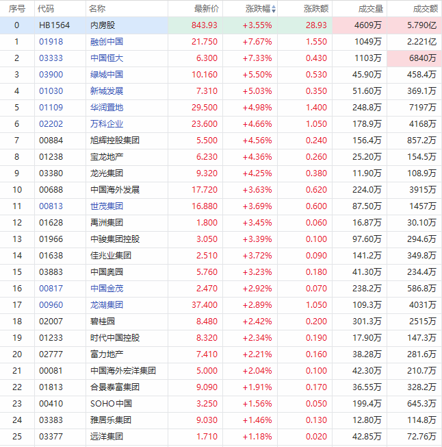 华盛资讯8月11日消息,内房股早盘集体走强,截至发稿,融创中国上涨7.67%;中国恒大上涨7.33%;绿城中国上涨5.50%;新城发展上涨5.03%;华润置地上涨4.98%;万科企业上涨4.66%;世茂集团、佳兆业集团等涨超3%;中国经贸、龙湖集团、碧桂园等涨超2%。