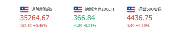 道指涨162.82点,或0.46%,报35264.67点;纳指跌72.09点,或0.49%,报14788.09点;标普500指数涨4.40点,或0.10%,报4436.75点。