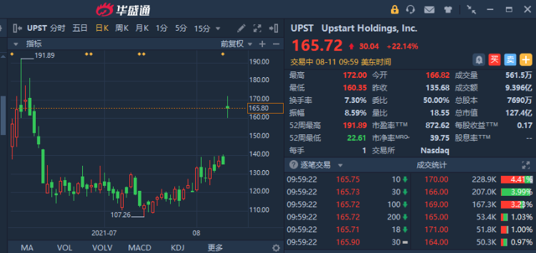 华盛资讯8月11日消息,美股盘初,人工智能借贷平台Upstart Holdings, Inc.(UPST)股价暴涨,截至发稿涨超22%,报165.72美元。