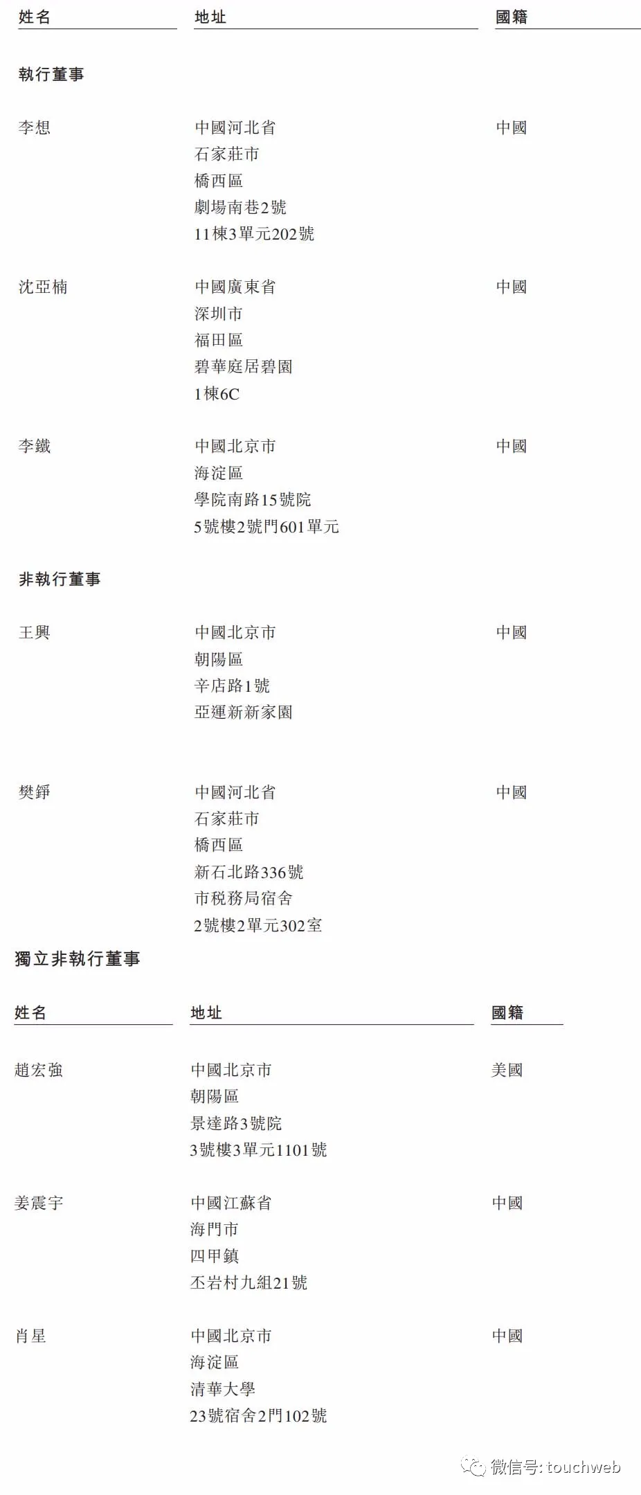 理想汽车的执行董事为李想、沈亚楠、李铁;非执行董事为王兴、樊铮;独立非执行董事为赵宏强、姜震宇、肖星。