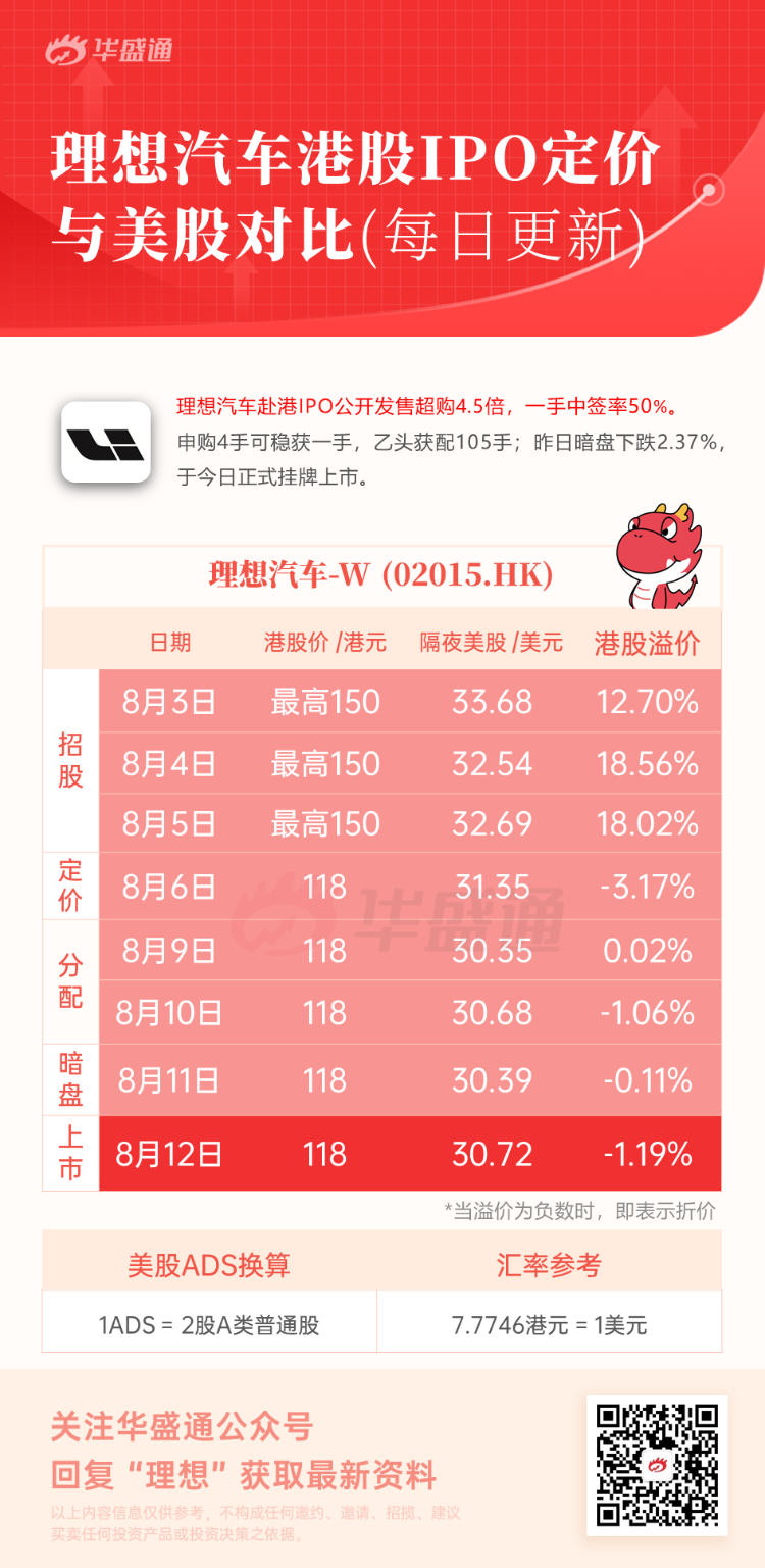 8月12日,理想汽车今日挂牌上市,港股IPO定价较隔夜美股折价1.19%,昨日暗盘收跌1.78%,公开发售超购4.5倍,一手中签率50%。