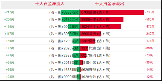 淡仓(认沽证及熊证)方面,周三个股相关淡仓净流入方面资金规模均较小;净流出方面,腾讯相关淡仓单日录得约738万港元资金净流出,剩余个股相关淡仓净流出规模普遍偏小。