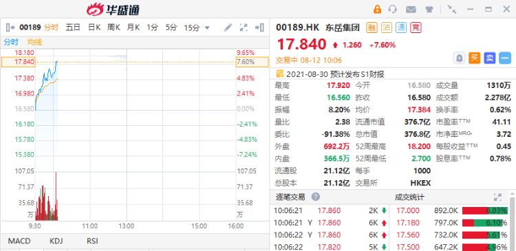 华盛资讯8月12日消息,东岳集团早盘逆市走强,截至发稿,现涨7.6%,报174.82港元每股,总市值386.4亿港元,成交278171亿港元。
