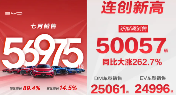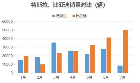 中国新能源车市场景气度继续维持,但特斯拉可能并不那么开心。数据显示,特斯拉7月在中国的交付量环比大跌69%至8621台,而比亚迪新能源车在7月的销量达到了惊人的50057辆,成为新能源汽车厂商销冠。