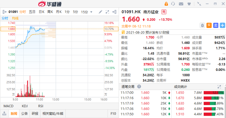 华盛资讯8月12日消息,南方锰业早盘强势上涨,截至发稿,现涨13.70%,报1.66港元,股价高见1.70港元,刷新52周高价,总市值56.91亿港元,成交额9424万港元,换手率1.71%。值得一提的是,该股今年来涨幅已超250%。