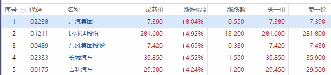 华盛资讯8月12日消息,部分汽车股拉升走强,截止发稿,广汽集团上涨8.04%;比亚迪股份上涨4.92%;东风集团股份上涨4.65%;长城汽车上涨4.52%;吉利汽车上涨4.24%。