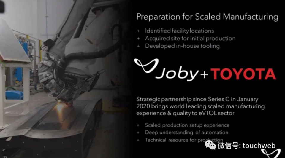 Joby总部则位于加州,已成立12年,是一家空中电动出租车初创公司,Joby正利用自主研发的电动垂直起降(eVTOL)飞行器及战略合作伙伴丰田的部分汽车制造经验,开发电动空中出租车服务。
