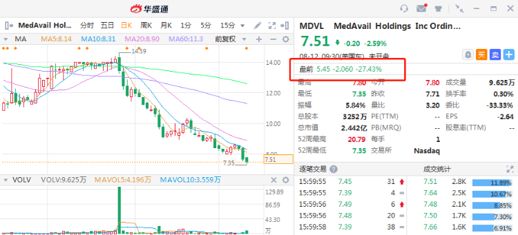 科技制药公司Medavail Holdings(MDVL)盘前跌超27%,此前下调2021年营收预期。