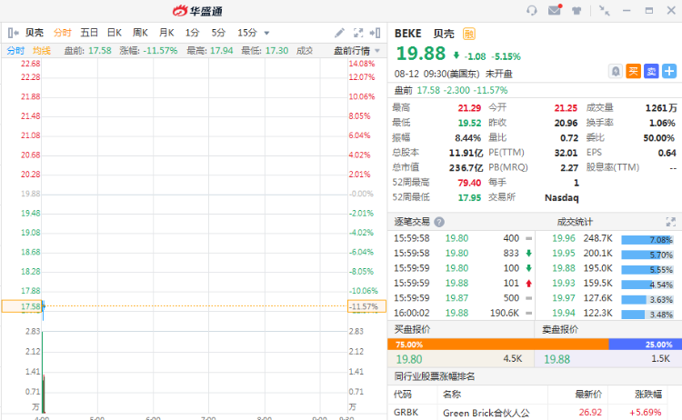 华盛资讯8月12日消息,美股盘前,贝壳(BEKE)跌近12%,预计第三季度营收将同比下滑约24.6%至29.4%。