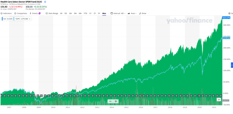 而从医药创新角度和该板块历史表现来看,Bell认为,医疗健康板块将是不受这些因素影响的板块。“这是一个能提供丰厚股息、现金流稳健的行业。”Bell补充道,同时值得关注的是,长期以来,医疗保健行业的整体表现轻松超过了标普500的表现。(如下图,绿色区域为医疗健康ETF XLV表现,蓝线为标普500指数表现)