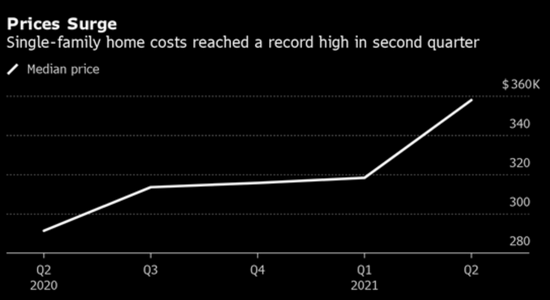 美国第二季度住宅价格创下纪录最高涨幅,买方市场竞争激烈。