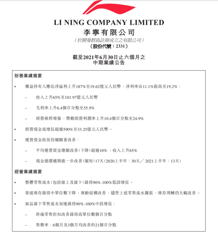 李宁(02331)发布公告,2021年上半年,公司收入101.97亿元人民币(单位下同),同比增长65%;权益持有人应占利润19.62亿元,同比增长187%;净利率由11.1%增至19.2%。