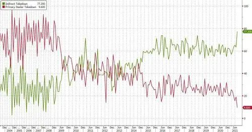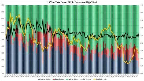 包括美联储和其他美国联邦政府实体在内的直接购买人获配13.1%,上次发行时为17.5%。而具有购买所有未能拍出国债以防止拍卖流产义务的一级交易商获配比例仅为9.6%,创历史新低。