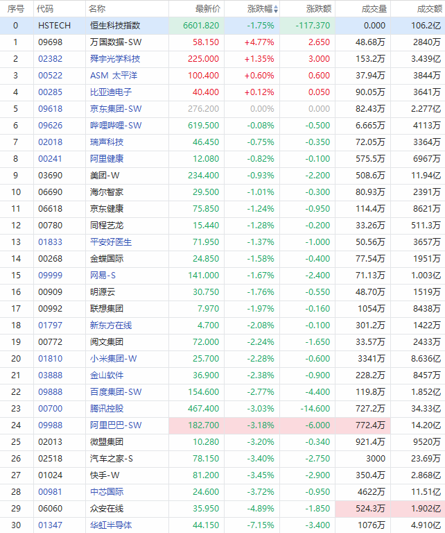 华虹半导体下跌7.15%;众安在线下跌4.89%;中芯国际、快手、腾讯、阿里巴巴等跌超3%;小米集团-W、新东方在线等跌超2%。