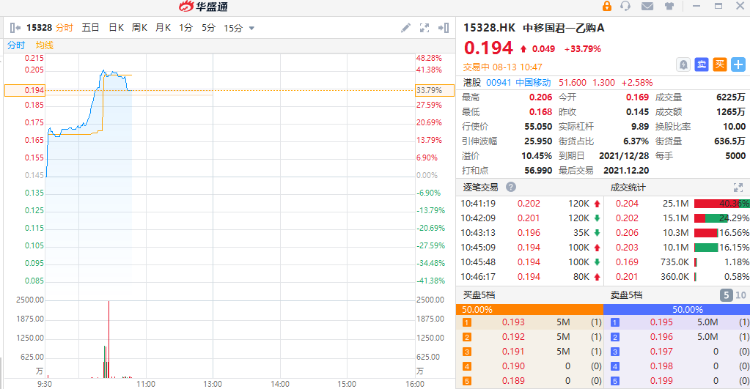 相关涡轮方面,中移国君—乙购A $15328.HK 涨33.79%,其行使价为55.05港元,到期日为2021年12月28日,引伸波幅达25.95,溢价10.45%。