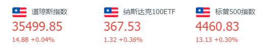 道指涨14.88点,或0.04%,报35499.85点;纳指涨51.13点,或0.35%,报14816.26点;标普500指数涨13.13点,或0.30%,报4460.83点。