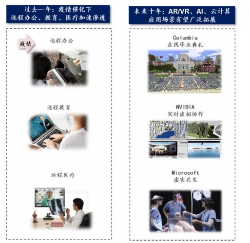 在过去的疫情一年中,大量企业被迫选择远程办公,催生了企业数字化转型,同样也催生了远程医疗和在线教育等应用场景的加速渗透。这些都是元宇宙的最初级场景。