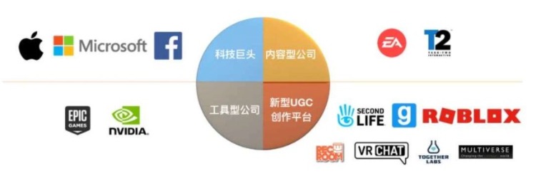 科技巨头,以微软、苹果、Facebook为代表,它们大多身兼数职,不仅涉足新型硬件计算平台,还兼顾内容生产;内容型公司以EA、Take-two为主,游戏玩家可在游戏中体验第二种人生,且能进行度假、虚假交易、做任务甚至进行远程电话会议——某种程度上相当于打造一个数字化世界。