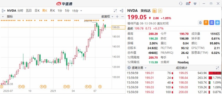 截止发稿,英伟达盘前涨幅为0.37%,报199.78美元。