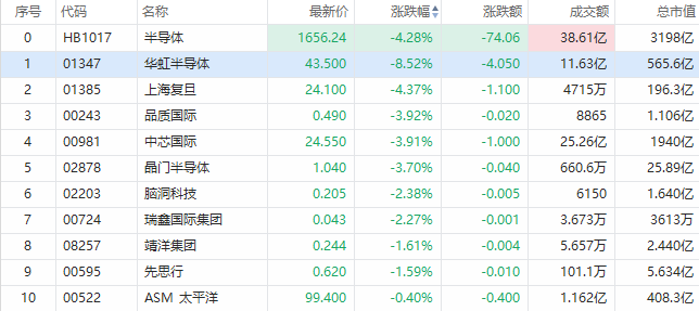 上海复旦跌4.37%;晶门半导体跌3.70%;ASM 太平洋跟跌。