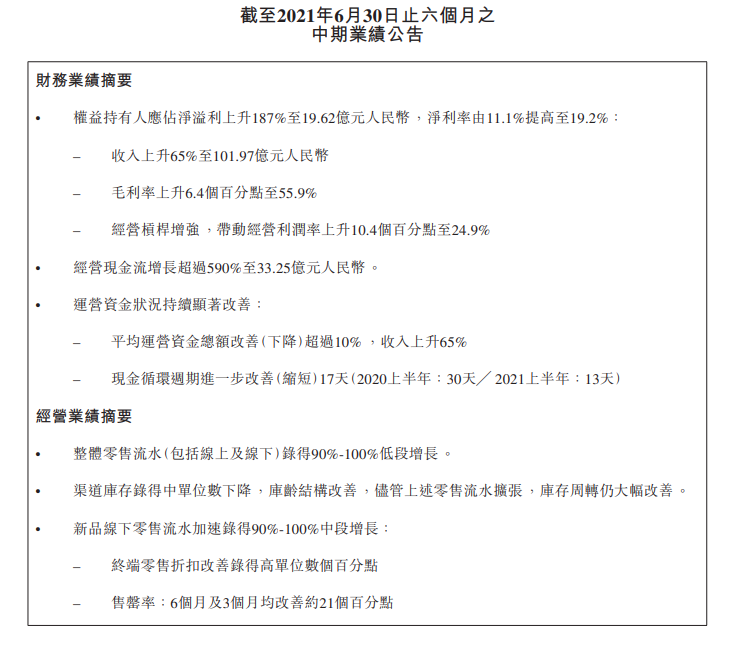 财报显示,李宁公司上半年毛利率有所增加,整体毛利率为55.9%(2020年为49.5%)。本期,零售折扣有明显改善;因存货原值下降和库龄改善而降低了部分存货拨备;另外毛利率较高的直面消费者管道(直营及电商管道)收入占比亦有所上升。以上所有因素促进了毛利率的显著提升。因此,本期的毛利率较上年同期上升6.4个百分点。
