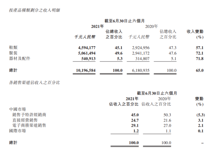 上半年李宁公司收入达101.97亿元人民币,较2020年同期上升65.0%,增幅显著。财报称,本期,得益于中国政府的有效疫情防控,国内疫情形势相对稳定,本集团针对疫情期间的各项销售改善举措持续获得回报。同时,得益于国内消费者对健康生活的要求提升、对国产运动品牌的充分肯定和大力支持,上半年各管道收入均录得可喜成绩: