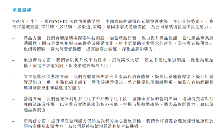 关于下半年展望,李宁公司称,产品方面,继续积极探索科技创新,加强产品研发,致力提升产品性能,强化产品专业运动属性,同时更紧密把握时尚趋势及运动文化,推出更紧贴消费需求的产品,为消费者提供多元化消费体验,扩大消费者群体,提高顾客忠诚度,深化品牌影响力;