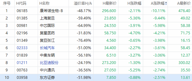 盘面上,康希诺生物AH股齐跌,A股跌10.11%至476.4元,H股跌2.11%至296.6港元。中芯国际A股收跌5.98%,H股截至发稿跌3.91%;上海复旦、复星医药齐跌。