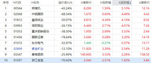 郑煤机A股收涨5.10%,H股截至发稿涨1.59%;中铝国际A股涨4.49%,H股截至发稿涨0.60%;洛阳钼业A股涨4.01%,H股截至发稿涨2.71%。