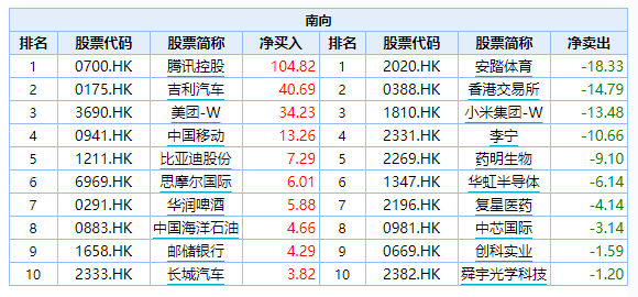 本周,南下资金净买入金额最高的标的为腾讯控股,一周净买入金额达104.82亿港元。此外,南下资金本周加仓吉利汽车40.69亿港元;加仓美团-W 34.23亿港元。