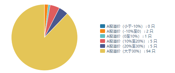 本周有94只A股溢价超过30%,5只溢价在20%至30%之间,5只在溢价10%至20%之间,1只溢价在0-10%之间,2只溢价在-10%至0之间。