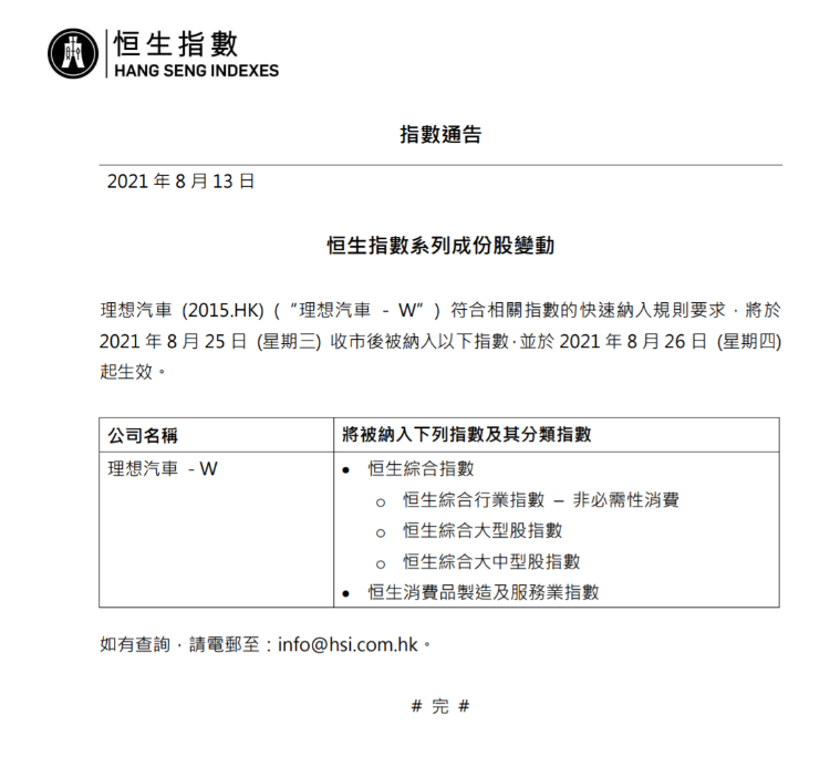 恒生指数公司:理想汽车(02015.HK)符合相关指数的快速纳入规则要求,将于2021年8月25日收市后被纳入恒生综合指数以及恒生消费品制造及服务业指数,并于2021年8月26日起生效。