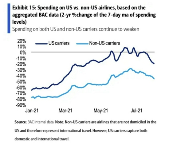 “这比6月下旬14.6%的近期高点有所下降。减速最大的仍然是机票支出,我们认为这反映了人们对达美航空变体的担忧。”