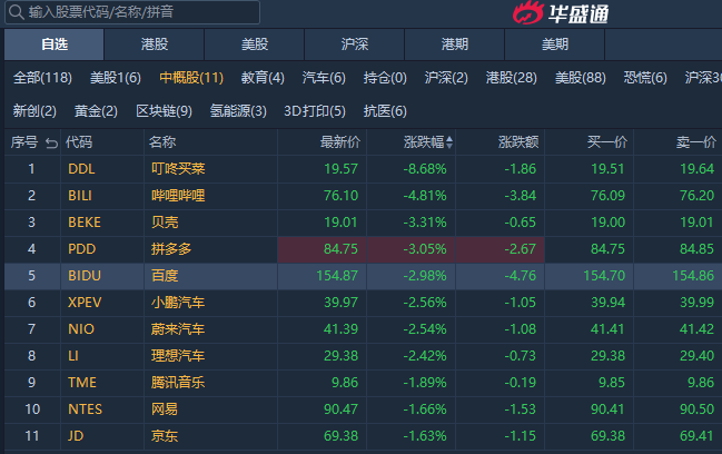 华盛资讯8月13日消息,周五美股盘初,热门中概股下跌,叮咚买菜(DDL)跌近9%,哔哩哔哩(BILI)跌近5%,贝壳(BEKE)跌超3%,百度(BIDU)跌近3%,蔚来(NIO)、理想(LI)均跌超2%。