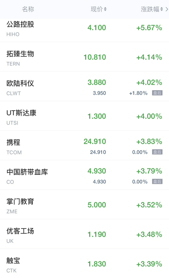 UT斯达康涨4%,携程涨近4%,掌门教育、优客工厂涨超3%。